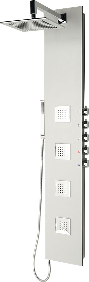 Sprchový kout v moderní koupelně dotváří elegantní sprchový panel, který oproti klasické baterii nabízí výběr proudu vody nejenom z ruční sprchy, ale i z hlavové sprchy, popřípadě i z masážních trysek. Sprchové panely lze zvolit v moderním stříbrném nebo efektním dřevěném dekoru a tím lze získat perfektní soulad s obkladem interiéru. Panel 5SIDE je vyroben z kompozitního materiálu a je určen pro montáž na stěnu. Ovládací prvky panelu jsou netradičně umístěny na boku, čímž je možno využít celé přední plochy panelu pro větší masážní trysky.