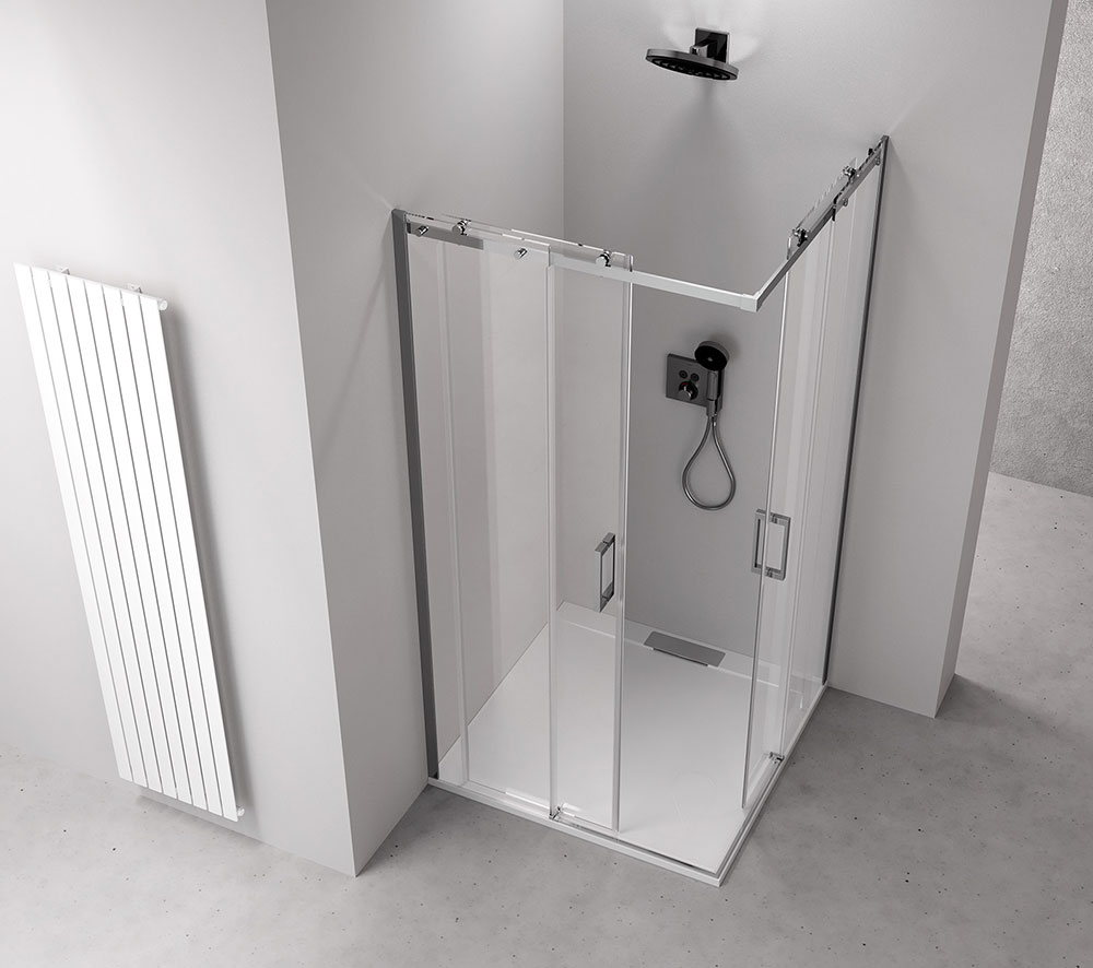 - Dveře jsou děleny na část posuvnou a pevnou - umožňují variabilní instalaci s levým nebo pravým otevíráním